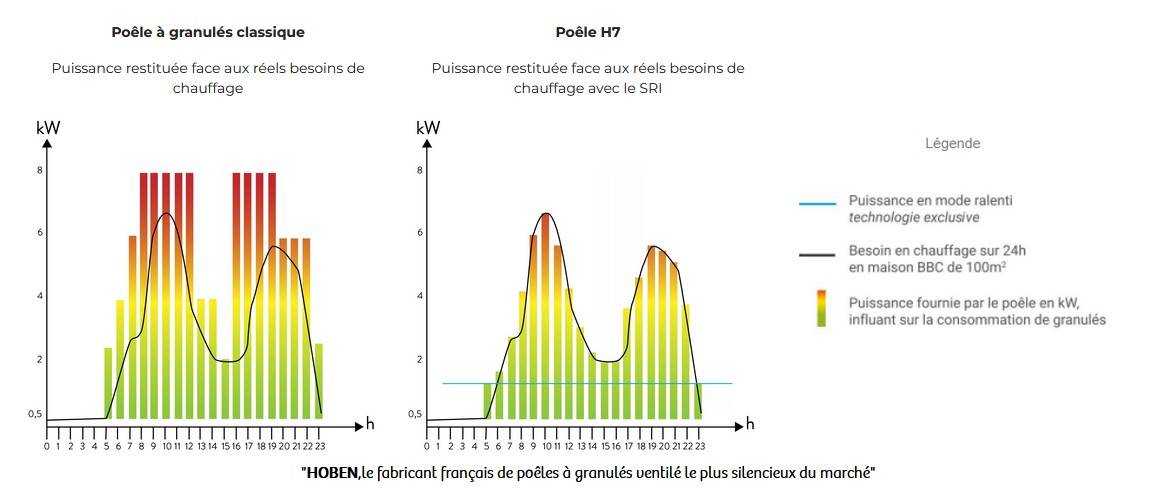 Contrairement aux poêles à granulés classiques qui fonctionnent par paliers (souvent trop chaud ou éteint), Hoben a révolutionné le confort thermique avec son SRI (Système de Régulation Intelligent).