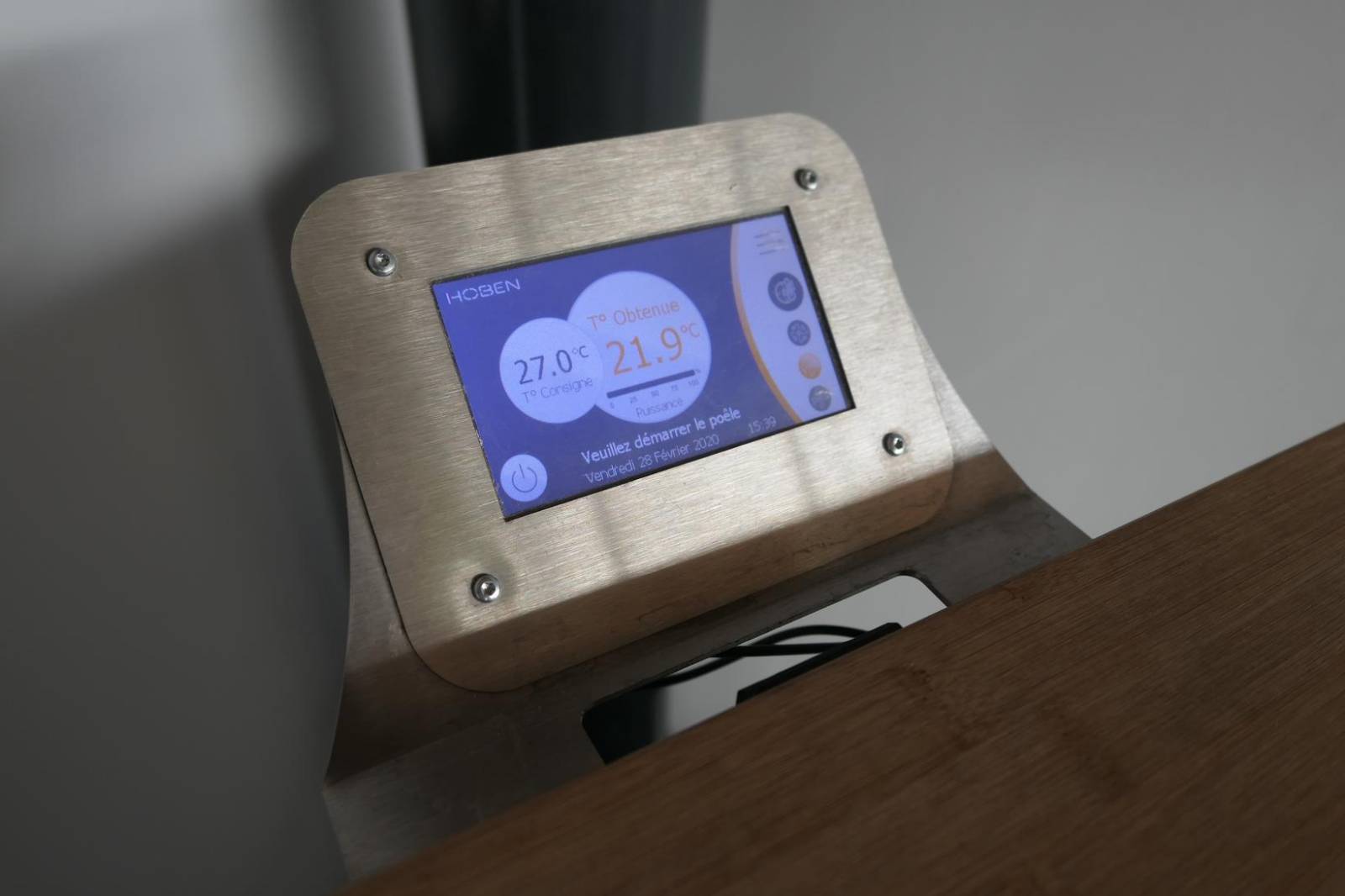 L'écran tactile intégré permet de créer jusqu'à 7 plages horaires par jour. Le poêle calcule lui-même son temps de préchauffe : si vous voulez 20°C à 7h00, il démarrera exactement au bon moment en fonction de la température ambiante réelle.